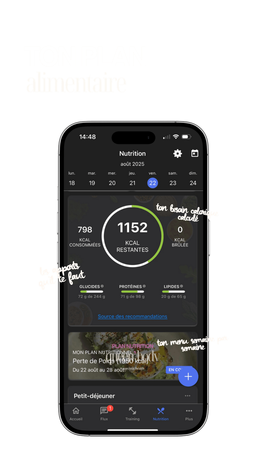 Perte de gras : fini les 1200 kcal et les haricots verts sans sel. Tu manges des repas pensés pour ton objectif.